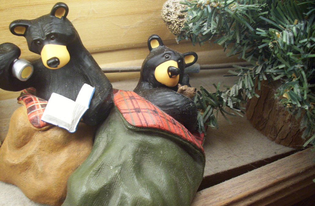 You’ll be happy to know that Bernadine and Beauregard Bearsaltandpepper now have company in the Downstairs Northwoods Bathroom. The new inhabitants aren’t directly descended from the Bearsaltandpepper family line, but they are distant cousins way back. They brought their own sleeping bags, and they’ve decided they are quite comfortable and will stay awhile. We haven’t yet discovered what their first names are, but the Mrs. does like to read by flashlight while the Mr. cuddles his teddy bear. (This darling figurine was a Christmas gift from my own Mr.!)