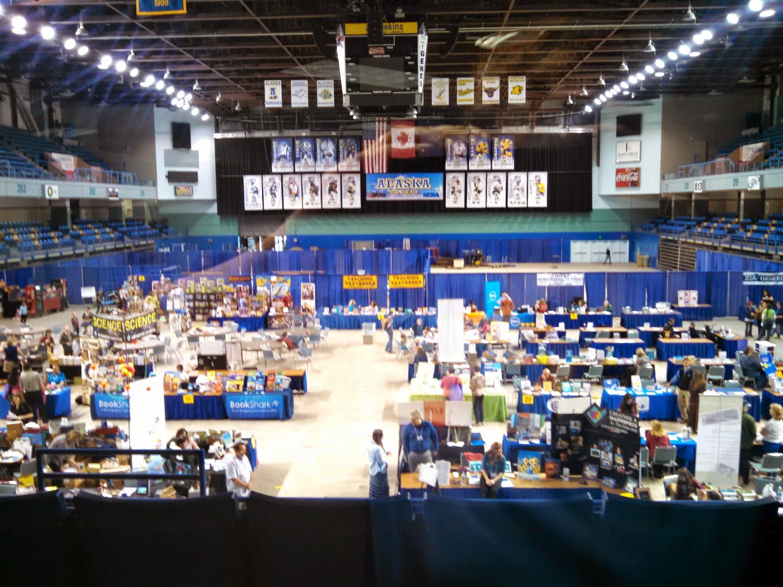 The Fairbanks IDEA curriculum fair started today. We have a nice booth location just inside the door. We weren’t able to use our new gray tablecloths because they are designed for eight-foot tables, and the tables at this event are six-foot. The blue ones are some we had from last year. It was just serendipity that they match the draping at this event so well.