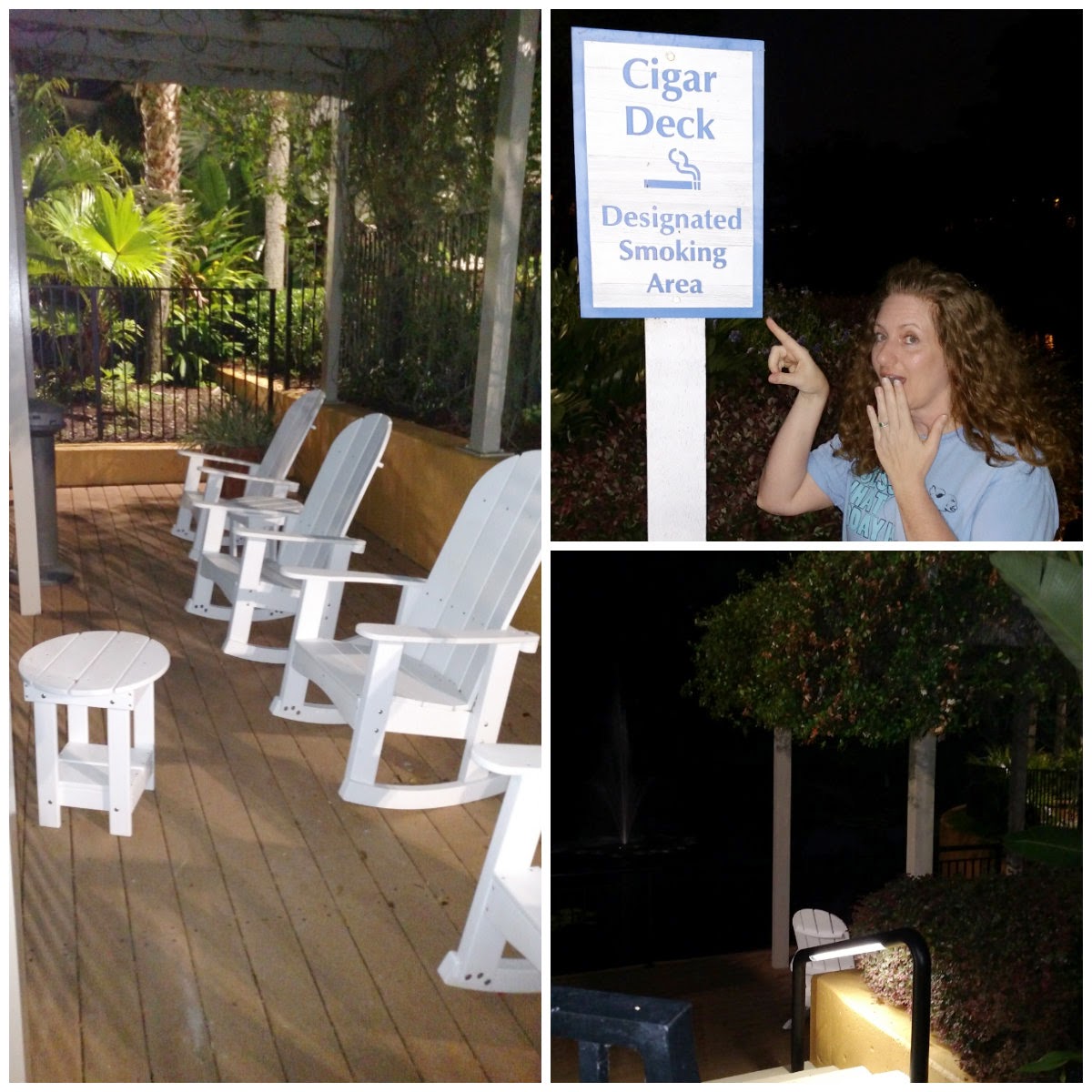 Late that evening, after we had loaded and unloaded some of the convention supplies and taken care of grocery shopping for the weekend, one of my co-workers, Sherry, and I explored the resort a little bit. We were tickled to discover that the smoking area was called the Cigar Deck. So pretentious! No one was smoking cigars (or anything else), and it was actually a very nice deck overlooking the lake.