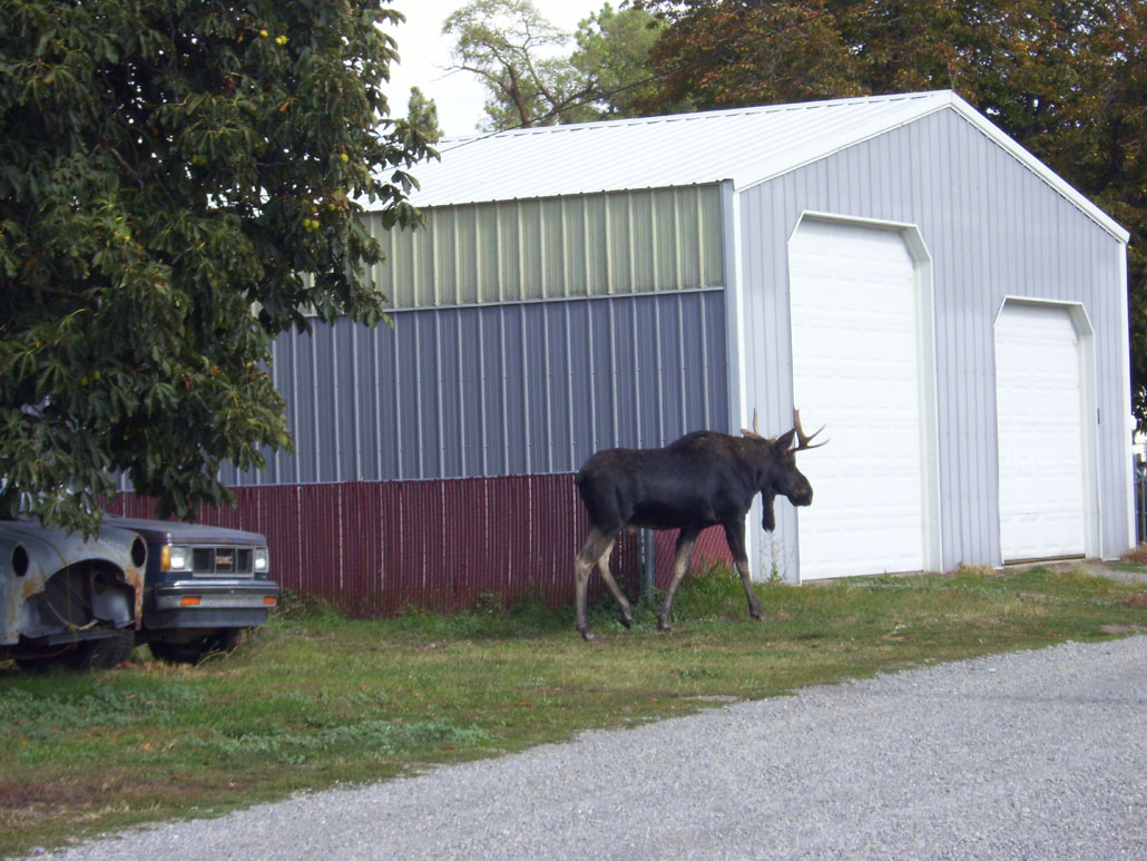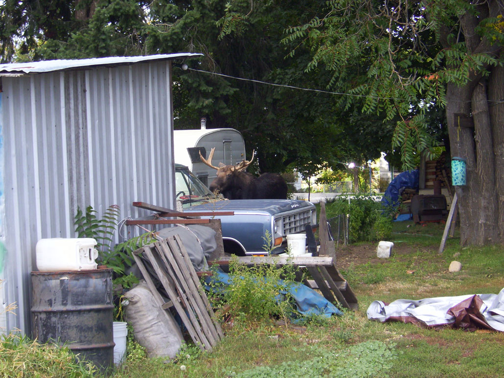 We only live about 2 miles from the print shop where Lyle works, so he usually comes home for lunch. Today as we were finishing lunch, his cell phone rang. That’s not unusual either, as his co-workers often have questions that need immediate answers. But he wasn’t on the phone long this time. He hung up and told us, “Loren says there’s a bull moose over by city hall, down the street from the print shop.”