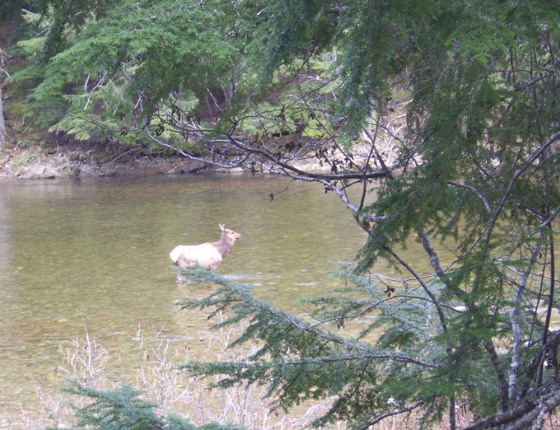 The highlight of the day was the elk sighting. We often see deer and other small wildlife on our drives, but it is rarer to see elk or moose. (We still haven’t seen a bear.) We saw 4 different elk this time. This one, wading across the river…