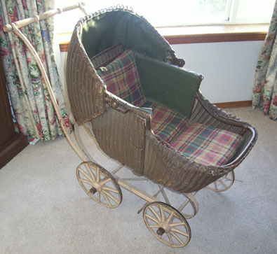 Alas, there were no strollers to be found. The only thing available was an antique wicker baby buggy circa 1925. Since it was forty years old and so shabby, they were able to get it for $10. Mother declared she liked it better than a stroller anyway, so they brought it home… and plopped me in it for many a happy walk.