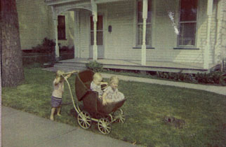 Here I’m sharing with my twin cousins. The girl twin gets to ride in the buggy with me, while the boy twin demonstrates his strong muscles by “pushing” us. I wonder how far he managed to get us on the grassy surface. Looks like some wise adult had probably lifted the buggy over off the sidewalk to slow his progress. Runaway babies would not be good.