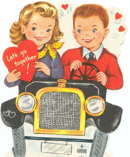 Here’s a darling one I came across recently and “sent” to my husband, just because of the vintage car and trailer. I have no idea what the message means: “…I’d trailer all around.” Is that supposed to be a pun for “trail her”? I dunno. But check out the license plate: “ME4U”! Too cute!