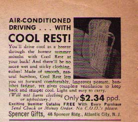 This is apparently what they considered “Air-Conditioned Driving” 60 years ago, before real air-conditioning was a standard option in most cars. “You’ll drive cool as a breeze through the hottest summer months with Cool Rest at your back! And there’ll be no more wet sticky clothing, either!” Bless their hearts!