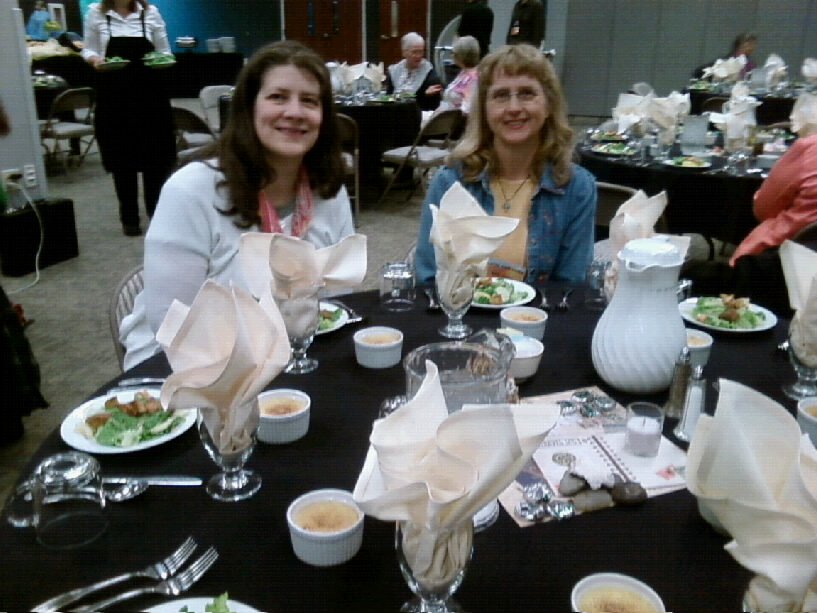 The conference concluded with a lovely banquet on Saturday evening. Mealtimes were always fun, getting to know the other writers around the table. The first question was always, “What do you write?” Over the weekend I progressed from saying, “Nothing. I’m just a wannabe.” to “I’m in the pre-writing stage. For now I just blog.” (That sounds better, don’t you think?) We also exchanged business cards so we could stay in touch after the conference was over. Susan said it reminded her of name cards in Little House on the Prairie!